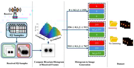 Dataset generation process: I−Q samples are collected with and without the presence of the jammer. Then, we compute the bi-variate histogram of the I−Q samples and translate it into RGB images. At last, we create two datasets of images with labels of non-jammed and jammed samples.