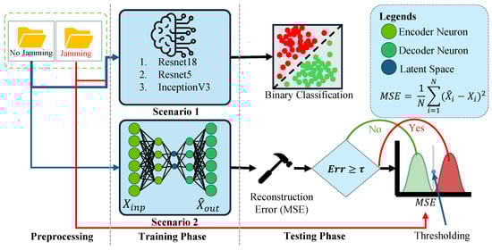 Scenario 2: Unawareness of Jammed Signals. The second scenario presents a more realistic case where only clear (non-jammed) samples are available for training. This scenario employs an unsupervised learning approach, where the system builds a profile exclusively from clear (legitimate) data to detect anomalies. During the training phase, the model is exposed only to “non-jammed” signals, learning to characterize normal behavior patterns and identify potential attacks as deviations from these patterns. The detection mechanism relies on establishing appropriate thresholds to distinguish between normal operations and potential anomalies. This approach is characterized by the following challenges: determining the best threshold values that balance detection sensitivity with false alarm rates, discriminating between new attack patterns and legitimate signal variations, and adapting to changes in normal operating conditions.