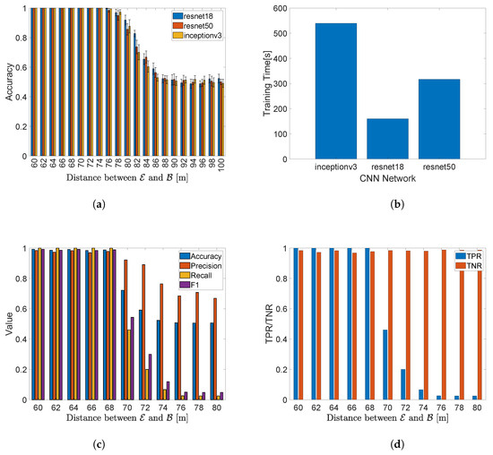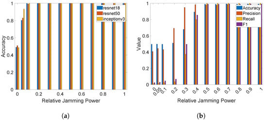 Multi-Class Classification. This methodology is considered when assuming Scenario 1 (jamming awareness); i.e., the model has previously been exposed to images generated from jammed signals. In fact, we consider two datasets, and , representing the jammed and non-jammed datasets, respectively. Each (where ) is divided into three subsets, namely , , and , each of which constitutes (), (), and () of the original dataset, respectively. We employ state-of-the-art CNN classifiers, specifically a CNN based on Residual Network (Resnet-18 and Resnet-50) and Inception-v3, implemented in MatLab2023b. Neural network models are pre-trained using the ImageNet database [62]. The input layers are adjusted to accommodate the output of the bi-variate histogram (image size), set at , while the output layer is modified to match the two classes of our problem, namely jammed and non-jammed.