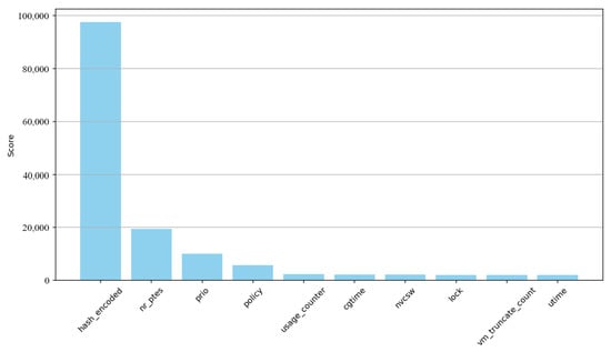 Figure 3 shows the importance of different features as evaluated by the GAN model. The hash_encoded feature stands out with a very high value, far exceeding all others, indicating its important contribution to the model. The next are n_rpte and prio with much lower but still high values, suggesting that they also have important roles to play. The other features are less significant; however, we decided to retain the top 10 most influential features to optimize the model’s efficiency and relevance.