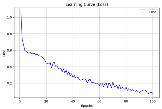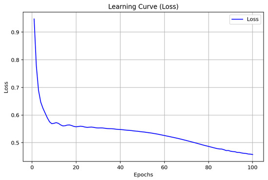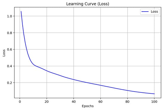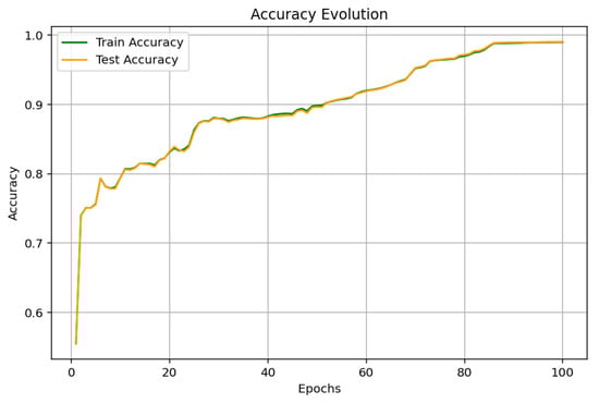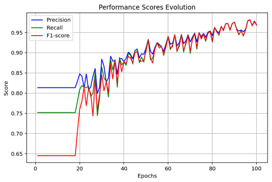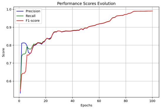 The outcomes derived for the ANN model, as depicted in Figure 6, Figure 7 and Figure 8, show a good trend of improvement in the performance metrics with 100 epochs. The accuracy evolution graph shows a continuous convergence between testing and training accuracy to 97.60%, which is a sign of the good generalization of the model. In the learning curve (loss), there is a steady decrease in the loss value, indicating effective learning without apparent signs of over-fitting. Lastly, the precision, recall, and F1-score curves confirm these observations, with consistent improvements and stabilization around high values after approximately 20 epochs, highlighting an excellent balance between precision and recall in malware detection.