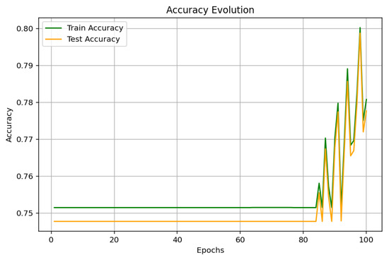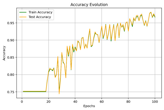 The GAT model performs very well on all the metrics, as indicated in Figure 12, Figure 13 and Figure 14. On the range of 100 epochs, accuracy evolution reflects constant improvement on training and test, and the model achieves 96.66% in training accuracy and 96.84% in test accuracy. The loss function keeps going down to a level of 0.0774 at the final epoch. Performance metrics like precision, recall, and F1-score also display this growing pattern to varying levels above 96%. An F1-score of 97.78% is particularly indicative of the good balance the model maintains between precision and recall in favor of its ability to correctly classify malware data with minimal loss.