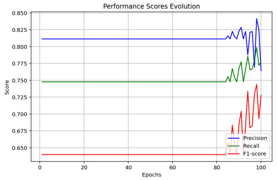 The values obtained for the CNN model, as presented in Figure 9, Figure 10 and Figure 11, indicate a gradual increase in the performance measures with the progression of the 100 epochs. The plot of accuracy evolution indicates a steady performance in the early epochs and then a drastic improvement in both the training as well as test accuracy after epoch 80 and then going up to 80%. The learning curve (loss) indicates the steady reduction and thus efficient training with no sharp over-fitting issue. Concerning the precision, recall, and F1-score, the values grow in a good direction with precision stabilizing at higher points compared to the recall and F1-score. This implies that the CNN model excels in recognizing malware but will need to be trained for better recall and overall balance.