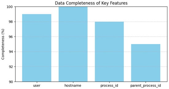 To substantiate the dataset’s quality and relevance, Figure 5 illustrates the completeness of key features, confirming minimal missing or inconsistent values. Figure 6 presents the distribution of user identities and hostnames, demonstrating the rich contextual diversity essential for comprehensive vulnerability assessment. The temporal stability and continuity of event logging are shown in Figure 7, which plots daily event counts over the observation period. Figure 8 highlights the realistic class imbalance between normal and vulnerability-related events. Finally, Figure 9 summarizes preliminary model performance metrics, evidencing the dataset’s suitability for benchmarking anomaly detection algorithms in operationally relevant conditions.
