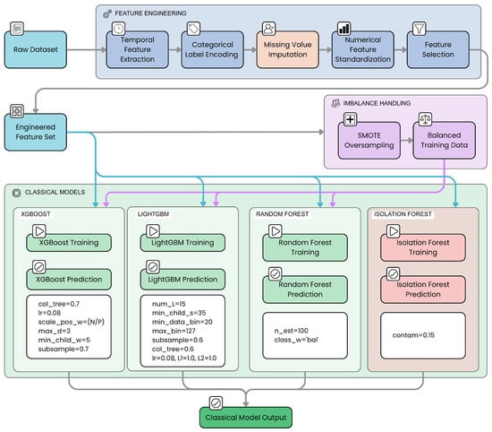 • 2.A. Classic Machine Learning Models: Traditional ML algorithms (e.g., Random Forest, XGBoost, LightGBM, Isolation Forest) are implemented and trained on the prepared data. This includes algorithm selection, model training, and hyperparameter tuning (e.g., via grid search with cross-validation) to optimize performance. Outputs include trained models and their initial performance metrics.