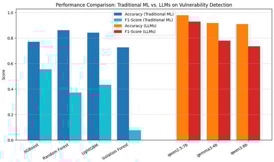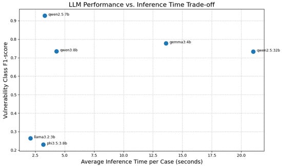 In terms of detection accuracy, models such as qwen2.5:7b consistently achieve superior results, with F1-scores exceeding 0.92 on vulnerability classification tasks, substantially higher than classical models like XGBoost and LightGBM, which typically reach F1-scores around 0.55. This confirms the first research hypothesis that LLMs effectively capture complex contextual and semantic patterns in unstructured log data that traditional feature-based methods struggle to model. The ability to achieve such performance on commodity hardware underscores the feasibility of deploying advanced AI for cybersecurity within SMEs.