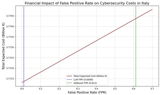 Figure 25. Expected total cybersecurity cost (in billions of euros) versus false positive rate, assuming fixed false negative rate and cost parameters. Vertical lines indicate empirical FPRs of LLM and XGBoost.