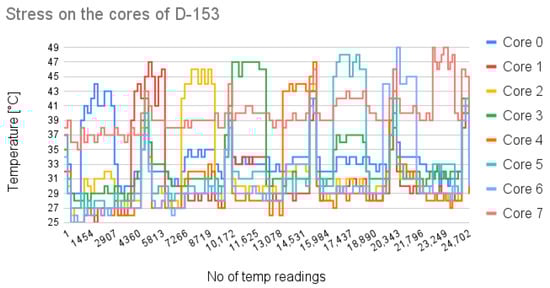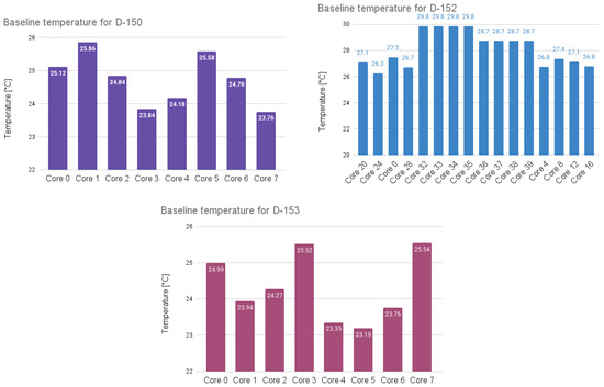 For each system, the baseline temperature of each core was measured; see Figure 1. This baseline was determined by continuously recording the temperature of all CPU cores over a 24-h period. Measurements were taken in 5-min intervals, with readings sampled every 20 ms, followed by a 15-min pause between intervals. This step is critical to identifying the idle temperature profile of each core under controlled conditions.