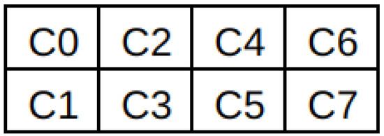 For each system, we used the stress application Stress-ng [26] to determine the physical layout of the cores. For each core, the stress application was taskset on every core at a time, with a CPU usage of 90%, while the temperature was recorded. In the created chart, it can be seen which core influences the temperature of which core during the stress experiment. That is, when stress was applied on Core 0 (dark blue), it can be seen in the first part of Figure 2 that the temperature increased to approximately 43 °Celsius. In the same area, the core that has a greater temperature than normal is Core 3 (yellow); Core 7 is not taken into consideration since it is the one on which the readTemperature script was run. This leads to the conclusion that Core 0 (dark blue) is physically located near Core 3 (yellow), and heat dissipates between them. Using this logic, we extracted data from charts like this and created mathematical permutation problems to determine the real physical arrangement of the cores on the die. The possibilities in Figure 3 resulted from knowing that for D-153, the 8 cores are placed 4 cores in two rows [27]. Taking into consideration the lowest temperatures in the baseline charts, together with the layout solutions, we decided to run the readTemperature script on Core 0 and runCommand on Core 5. Similar experiments were performed for the other two systems.