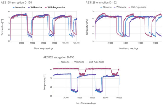 Furthermore, the level of background noise was tripled for the AES-128 encryption algorithm to evaluate whether the increase in interference would affect the thermal footprint associated with the cryptographic operation.