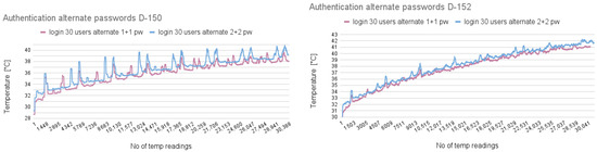 A CPU temperature sensor with a low resolution of 1 °C limits the precision of thermal monitoring, making it difficult to distinguish the temperature of individual commands; from here comes the methodology of running multiple commands. However, this is not the case for login commands, which can be individually identified. Therefore, we had to create multiple traces of the experiments and use the average of those measurements to increase the accuracy of the temperature readings. However, we did not need tens of thousands of traces as in other studies such as [7]. Moreover, the technique is in the early stages of development, and it needs to be automated in order to be applied in real-life scenarios.