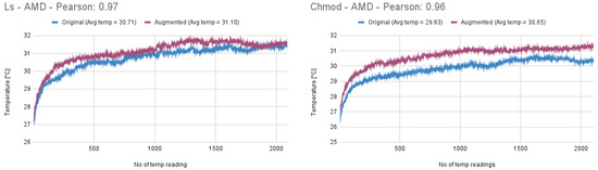 First, the original method was reproduced on our three systems. The results can be seen in Figure 4, Figure 5 and Figure 6, where blue is the original command and pink the augmented one. It can be seen that the original command has a lower temperature than the augmented one, meaning that the addition in the code consumes more power, dissipating more heat. The Pearson correlation index, over 0.9, shows that the original and the augmented commands have very similar patterns.