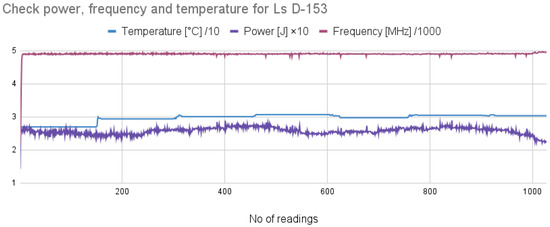 Moreover, we saw that on D-153, there are some visible spikes in the temperature, as seen in Figure 11. To identify their origin, we performed a small experiment in which we read the power and frequency, together with the temperature, while the ls command scripts were running. The results can be seen in Figure 19, where pink is the frequency, blue is the temperature, and purple is the power. It can be seen that, during the execution, all of them remain stable, with no noticeable increase or decrease. This leads to the conclusion that the spikes are created by using multiple traces for the final result.