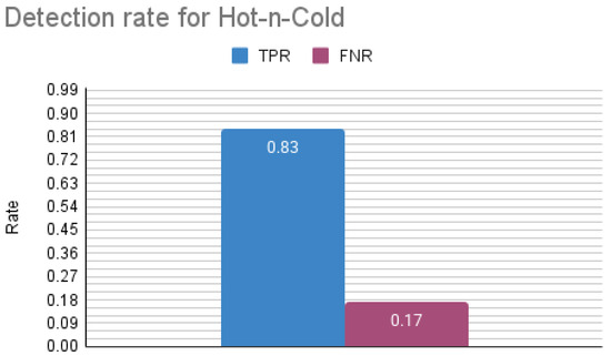 In addition, to measure the technique in more quantitative detection metrics, we have calculated the detection rate (True Positive Rate—TPR) using Formula (1), and the miss rate (False Negative Rate—FNR) using Formula (2), where we took True Positives (TPs) as the number of runs where injection was detected and False Negatives (FNs) as the number of runs where injection was missed. The results can be found in Figure 20, with a detection rate of 83%.