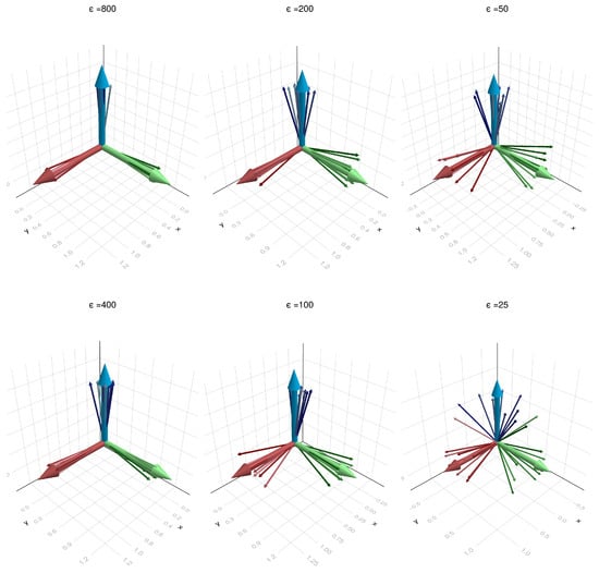 To sample from the Bingham distribution, we follow the rejection scheme described in [14], which we reproduce in Appendix D. Figure 1 demonstrates the effect of the privacy parameter . In each subfigure, the action of the unmodified quaternion on the standard coordinate system is depicted in bold, while the actions of the samples from the corresponding Bingham distribution are shown as thinner arrows. Colors label corresponding axes. As expected, smaller values of the privacy parameter correspond to higher levels of noise, and hence to increased privacy.