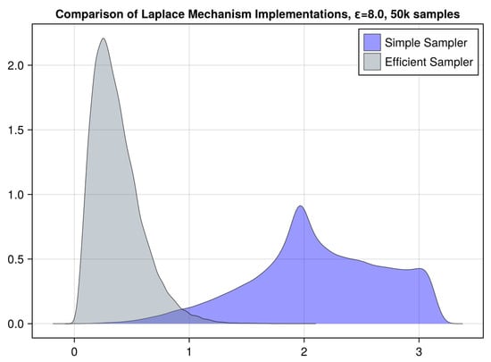 But both mechanisms are based on different base distributions—the Bingham mechanism arises from a -Gaussian distribution constrained to reside on , while the Laplace mechanism is based on an exponential distribution. These distributions have decidedly different characteristics—the Gaussian features narrow tails and a smooth, broader peak around the mean, while the Laplace decays significantly more slowly, but has a sharp peak at the mean. These different shapes should in turn lead to differently concentrated noise samples at the same privacy level. Thus, both mechanisms have different privacy–utility tradeoffs. In particular, it might be tempting to assume that the Bingham mechanism could be more appealing in settings where large deviations from the original data are particularly undesirable—for instance, in risk-averse applications or under loss functions that heavily penalize outliers. Our experiments, however, show a different picture. In the low-to-medium-privacy regime, the tails of the Bingham distribution are always heavier than those of the corresponding Laplace mechanism. This surprising fact is explained by the fact that the geometry and topology of SO(3) change the behavior of the distributions in unexpected ways: the tails of the Gaussian become thicker, while the tails of the exponential distribution become slimmer when mapping the distributions to SO(3). Furthermore, the proof for the privacy of the Bingham mechanism was tailored to a different metric and then converted to the geodesic distance. The proof itself also uses a number of inequality constraints that might not be tight. It is likely that the Bingham mechanism actually fulfills even higher privacy guarantees than the ones proved in our manuscript. We thus cannot yet prove a general superiority of the Laplace mechanism over the Bingham one for all values of . At this point, however, for utility-focused applications, we can unconditionally recommend the Laplace mechanism over the Bingham one, as it has better utility for mid-to-low-privacy scenarios and has a much more efficient implementation. However, as Figure 2 clearly shows, it is crucial to use a stable Laplace sampler implementation with high sampling efficiency.