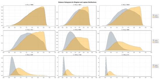 Histograms of the distance distributions of samples generated from the Bingham and Laplace mechanisms for different privacy budgets. Indistinguishability radii were computed with respect to the Laplace mechanism at a level of .