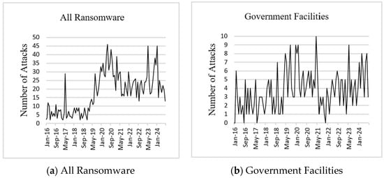 Table 2 presents descriptive statistics of the ransomware dataset, including the date, the number of incidents, and the monthly average. Based on the data, government facilities had the highest number of attacks and the highest average compared with other sectors while critical manufacturing had the lowest total and average. Figure 1 visually depicts the monthly aggregation of all ransomware attacks and for each sector. From the graph, we can see an increase in the number of ransomware attacks during and after the COVID-19 era, which is attributed to a wider attack surface and evolving attack vectors [34]. Nonetheless, based on Figure 1, it is clear that certain industries, such as healthcare and public health, as well as critical manufacturing, have also experienced this increase.