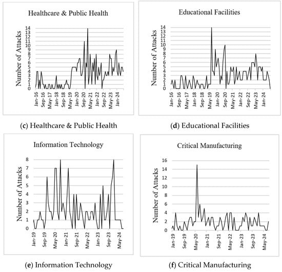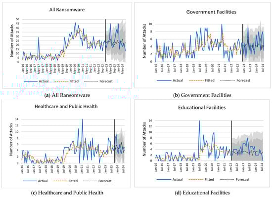 Forecasts were effectively fitted for government facilities, healthcare and public health, educational facilities, and critical manufacturing, though accuracy varied. Models for government facilities and healthcare achieved reasonably accurate predictions, enabling strategic resource allocation and improved resilience. In contrast, predictions for educational facilities, information technology, and critical manufacturing were less accurate. One possible reason for the varying accuracy in the prediction models may be due to structural and operational factors. Heavy dependence on third-party vendors can introduce uncontrolled vulnerabilities that vary widely in security posture, whereas the breadth and complexity of a sector’s attack surface, shaped by legacy systems, interconnected devices, and distributed networks, can create irregular and harder-to-predict attack patterns [44]. Furthermore, variations in organizational security maturity, incident-reporting practices, and regulatory oversight further contribute to differences in predictability. These factors manifest differently across sectors. For instance, healthcare and public health are relatively predictable because they maintain standardized IT practices, enforce regulatory compliance, and have established incident reporting mechanisms [45]. Government facilities, on the other hand, exhibit moderate predictability due to structured networks, though third-party vendor dependencies and varying local security practices can introduce variability [46]. However, educational facilities are less predictable because of diverse IT systems, frequent onboarding and offboarding of users, and inconsistent security enforcement across campuses [47]. Similarly, the IT and critical manufacturing sectors are highly unpredictable due to complex, heterogeneous networks, broad attack surfaces, and reliance on legacy or industrial control systems (ICS) that are frequently targeted [48]. These sector-specific characteristics may help to explain why some models produce higher forecast errors than others. Another possible reason is the absence of external variables such as economic conditions. Economic conditions may also influence a sector’s ability to maintain robust security infrastructure [49]. Underfunded sectors often prioritize operational costs over security, making them more vulnerable and more willing to pay ransoms [50]. Future work could incorporate additional external and structural variables into the modeling process to improve predictive accuracy and provide actionable, sector-tailored threat forecasts.