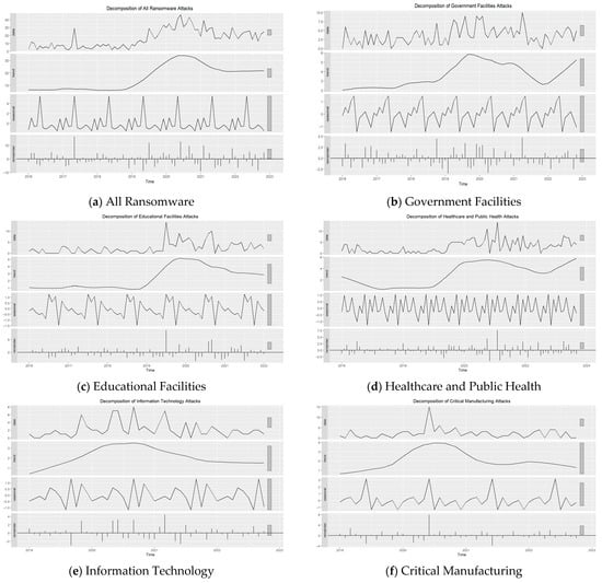We utilized the STLF package in the R statistical software (version 4.4.2) to perform STL decomposition and forecasting. The number of ransomware attacks was used as the dependent variable, whereas monthly periodicity was the independent variable. Each dataset was divided into 80% training set and 20% testing set. The training set was utilized to develop and train the fitted time-series models, while the testing set was employed to evaluate the models’ performances. Moreover, STL decomposition was applied to the training set to extract the trend, seasonal, and noise components. Based on Figure 2, all datasets exhibited a similar increasing trend in ransomware attacks starting in 2019. However, government facilities (Figure 2b) and the healthcare and public health sector (Figure 2d) are the only ones showing a continued increase beginning in 2022, whereas educational facilities (Figure 2c), information technology (Figure 2e), and critical manufacturing (Figure 2f) show a slight decline.