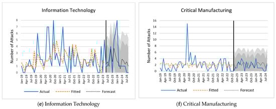 Figure 3 represents the actual, fitted, and forecasted values for all datasets along with the 80% and 95% prediction intervals. Each graph shows the number of ransomware attacks over time, with past data on the left and the predicted number of future attacks after the solid vertical line. For all ransomware incidents (Figure 3a), the fitted line smooths the actual data into a gradual rise peaking around 2021, followed by a decline that aligns with historical trends. The forecast projects a continued downward trajectory with minor fluctuations, while the 80% and 95% confidence intervals widen over time, reflecting growing uncertainty, particularly within the broader 95% range. In the government facilities sector (Figure 3b), the fitted line captures a peak in mid-2020 followed by a steady decline. The forecast suggests stabilization with small variations and widening confidence intervals signal increasing uncertainty. For healthcare and public health (Figure 3c), the fitted line shows a peak around mid-2020 and a fluctuating decline consistent with historical patterns. The forecast points to possible stabilization, with progressively widening confidence intervals indicating greater uncertainty in long-term projections. In educational facilities (Figure 3d), the fitted line smooths a sharp mid-2020 peak into a gradual rise and decline, closely following actual data. The forecast anticipates stabilization at lower levels, with confidence intervals expanding to show increasing variability in possible outcomes. For the information technology sector (Figure 3e), multiple peaks between 2019 and 2021 are smoothed into a declining trend. The forecast predicts stabilization with minor fluctuations, while widening intervals highlight increasing uncertainty in future attack numbers.” Finally, in the critical manufacturing sector (Figure 3f), the fitted line follows a notable mid-2020 peak and gradual decline. The forecast indicates a generally stable but fluctuating trend, with widening intervals reflecting greater uncertainty over time.
