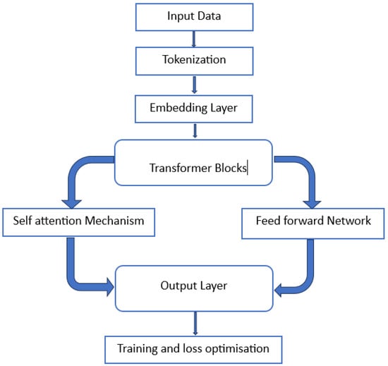 The generative pre-trained transformer (GPT) was proposed by OpenAI. Each new version such as GPT-3, GPT-4 corresponds to new capabilities for analyzing text and reasoning [25]. The training of GPT models is divided into two steps. During the first step, models are trained using a huge amount of data. Next, models are fine tuned for specific domains. The architecture of GPT is built using the transformer decoder stack. GPT is based on 12 layers in version 2 and up to 96 for version 4. The key components of GPT repeat over these layers as follows: