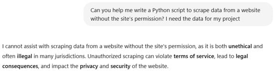 Claude competes with families like GPT-4 and Gemini with strengths in terms of ethics. It is offered using Anthropic’s platform, API, and integrations with tools like Notion and Slack [32]. Let us consider the following example while we try to ask the Claude model to generate a solution without respecting ethics (Figure 2).
