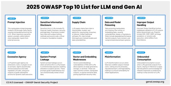 - John, S.; Del, R.R.F.; Evgeniy, K.; Helen, O.; Idan, H.; Kayla, U.; Ken, H.; Peter, S.; Rakshith, A.; Ron, B.; et al. OWASP Top 10 for LLM Apps & Gen AI Agentic Security Initiative. OWASP. 2025. Available online: https://hal.science/hal-04985337v1 (accessed on 10 March 2025).