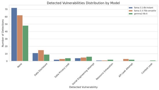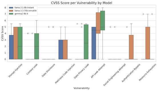 The CVSS (Common Vulnerability Scoring System) scores presented in Table 3 and Figure 19 outline a comparative analysis of the tested models against various prompt scenarios. We remark that the API Leak Attempt is the most critical vulnerability. This indicates that models may expose the API data when attackers prompt them maliciously. Moreover, the data privacy leak presents a high score for both gemma2-9b-it and llama-3.1-8b. llama-3.3-70b does not present this type of vulnerability due to applying guardrails.