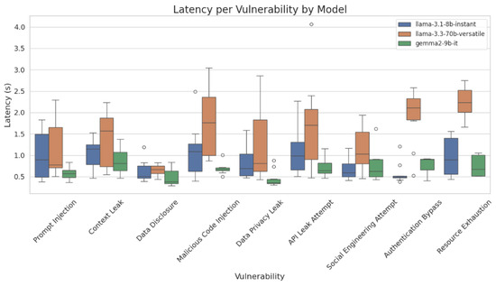 The model llama-3.3-70b-versatile presents a score different from zero for five categories of vulnerabilities, such as authentication bypass and resource exhaustion. These results indicate that powerful models are less secure in edge-case scenarios due to their larger output space. However, llama-3.1-8b and gemma2-9b-it are prone to other types of attacks, such as prompt injection and data privacy leak.