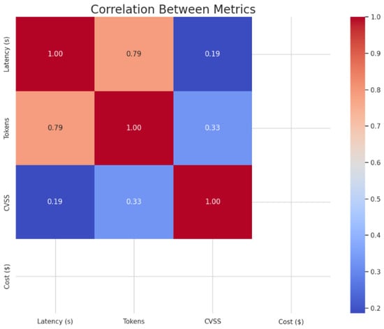 In order to quantify the relationship between all metrics, we computed the correlation between them in Figure 20. As observed in Figure 20, the highest correlation is present between latency and the number of tokens. This correlation is expected since longer responses need more time to be sent. The latency in LLMs depends on the output verbosity. Moreover, CVSS presents a weak correlation with other metrics. That means that the severity of vulnerabilities does not depend on the length of outputs. Security issues could be observed for longer and shorter outputs. For the cost, we remark that it has no impact since we used free models. In conclusion, these observations highlight that metrics are independent. Thus, to overcome vulnerabilities, we should consider vulnerability detection as a separate problem, decoupled from other performance metrics.