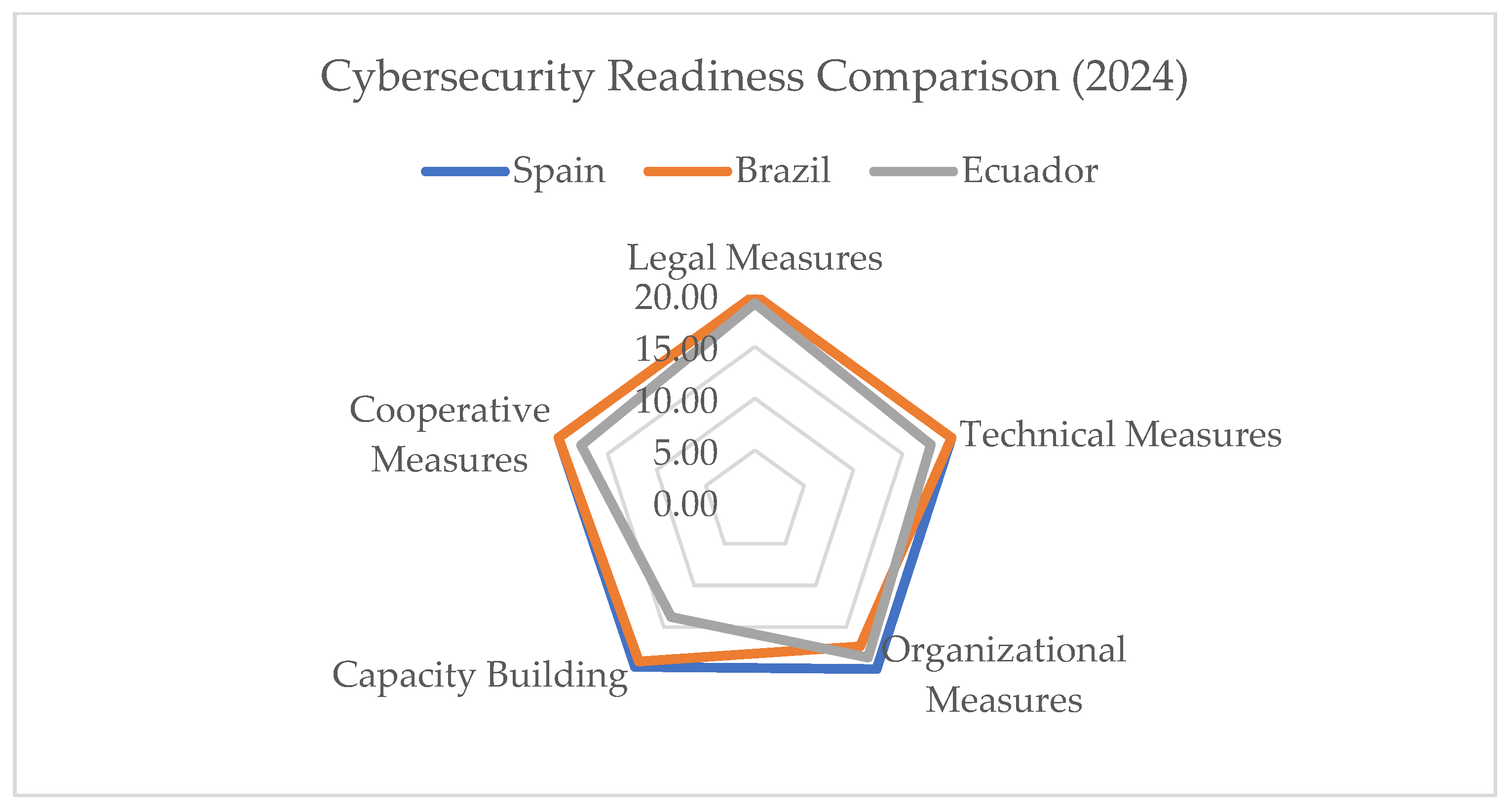 The International Telecommunication Union’s (ITU) Global Cybersecurity Index (GCI) reveals a substantial improvement in Ecuador’s readiness between 2020 and 2024, directly affecting the pillars of legal measures and international cooperation. This progress reflects local efforts such as the enactment of the Organic Law on Personal Data Protection (LOPD) in 2021 and the National Cybersecurity Policy. However, Ecuador still lags below the regional average in technical capabilities and specialized skills development. This is demonstrated by the ITU report, which highlights that countries that have integrated international frameworks such as the NIST CSF and fostered public–private partnerships show more accelerated and resilient improvements in the face of complex. This trend underscores the need to invest in technical capabilities and professional training.