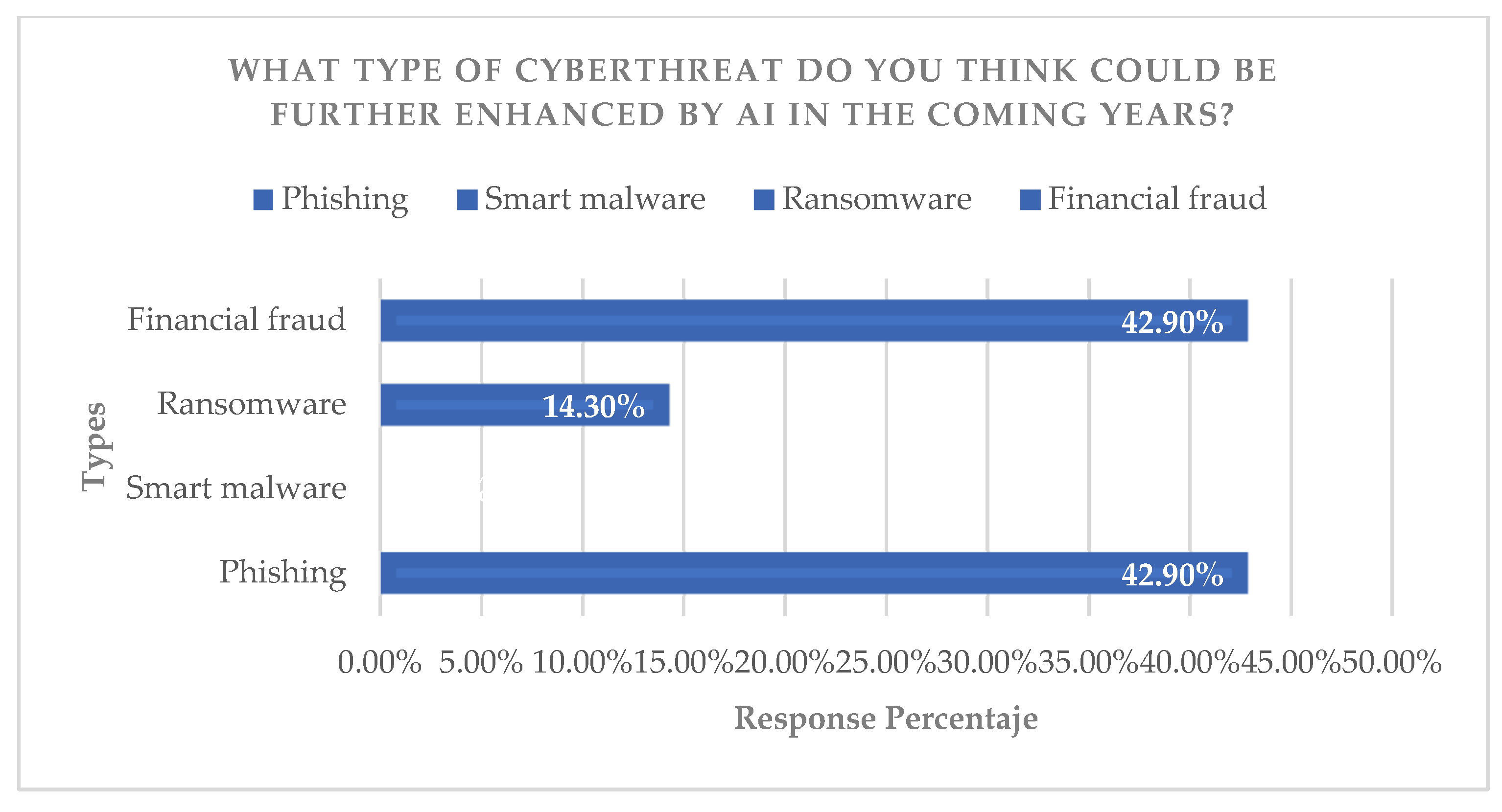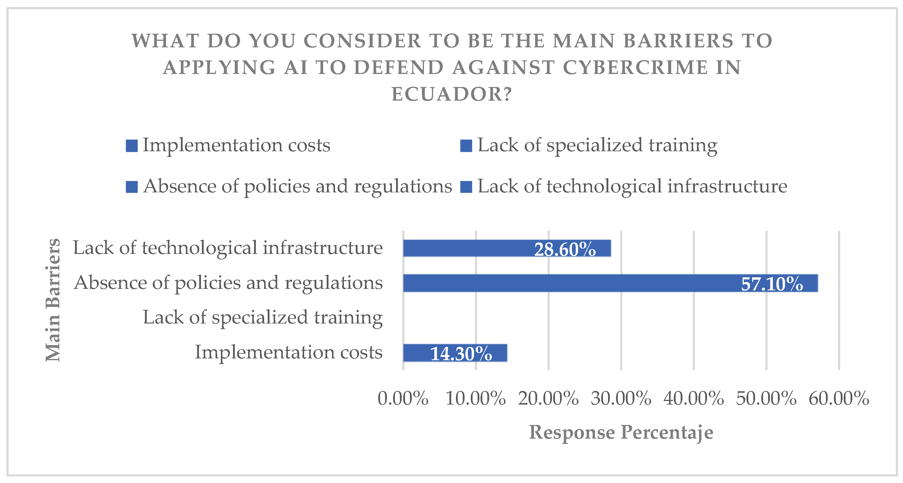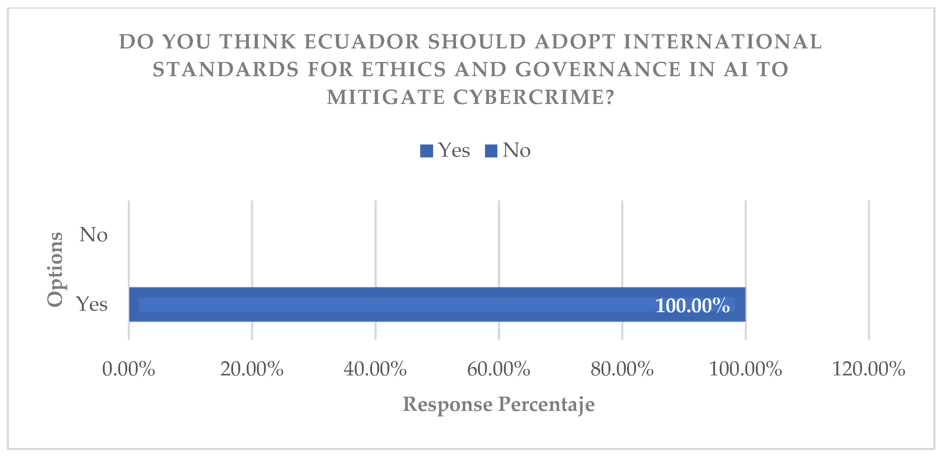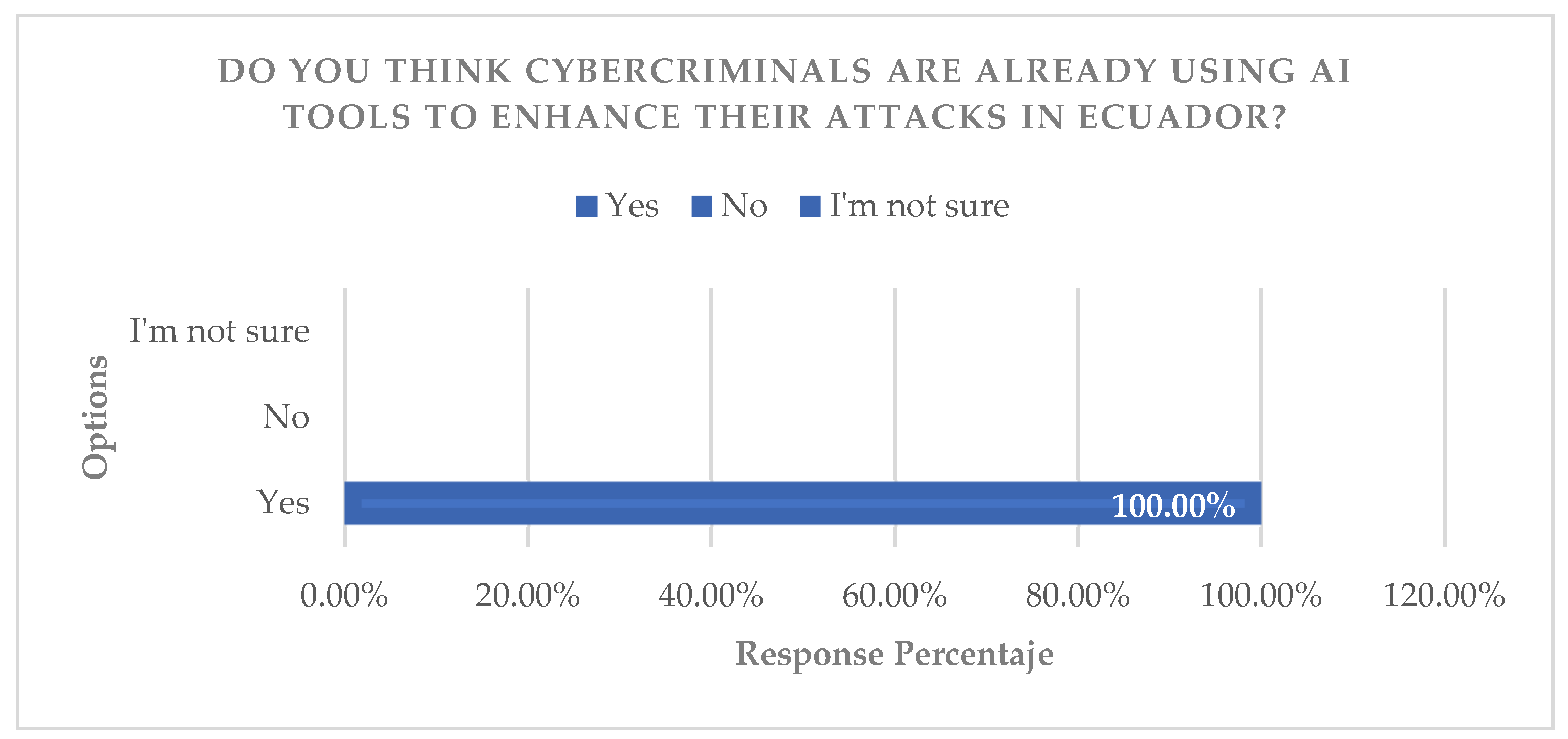 Regarding the “threat identification” indicator, it was shown that most respondents perceive and have heard of cases where cybercriminals are already using AI in Ecuador. The interviews, analyzed using perception and visualization criteria, show that citizens and experts in the field validate the hypothesis that international threats are applicable to the local context, discussing the urgency of adopting advanced countermeasures (