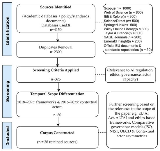 This review followed a structured, hybrid systematic–scoping design. The process was inspired by the systematic review protocol PRISMA (Preferred Reporting Items for Systematic Reviews and Meta-Analyses) [], but adapted to the interdisciplinary nature of AI governance and the inclusion of both academic and policy sources (Supplementary Materials). The systematic dimension ensured comprehensive coverage of rapidly evolving governance and regulatory frameworks. In contrast, the scoping dimension enabled the integration of earlier works on contextual actors (e.g., SMEs, public authorities), particularly those with longstanding structural capacity constraints. This dual approach provided both up-to-date insights into the EU AI Act and related frameworks, as well as a longitudinal perspective on persistent governance challenges.