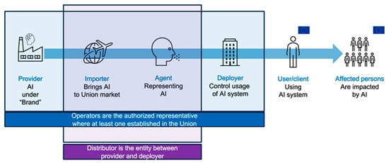 The preceding sections have outlined the EU AI Act’s risk-based structure and associated obligations. To understand how these requirements are applied in practice, however, they must be examined within the broader AI value chain. While the Act assigns distinct legal responsibilities to roles such as providers and deployers, these actors operate within a larger ecosystem of interdependent entities. The EU AI Act establishes a structured taxonomy of actors involved in the development, distribution, and use of AI systems. Article 3 defines the following actors: