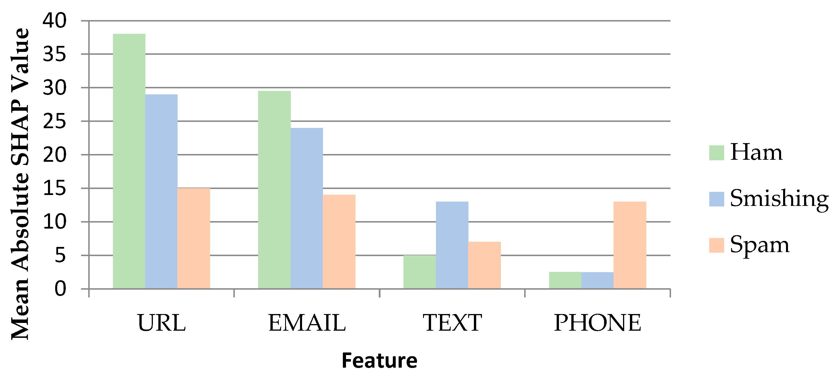 Shapley values are applied for feature selection due to their model-agnostic nature, allowing effective estimation of feature importance across different machine learning models. A major advantage of Shapley values is their ability to handle correlated features by assigning lower importance to redundant variables, ensuring that only unique contributions enhance model performance. In this study, Shapley values helped prioritize features while maintaining model accuracy and reducing classification time. The SHAP analysis revealed that structural indicators, such as the presence of URLs, email addresses, or phone numbers, contributed the most to classification, alongside semantic text embedding. To simplify interpretation, the mean absolute SHAP value was used, providing clear insights into the most influential attributes in the dataset.