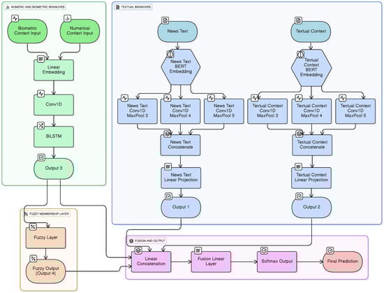 The outputs from all four primary branches: news text, textual context, biometric context, and numerical context are concatenated as the fuzzy membership output. The fuzzy membership output represents the degree of belonging of a feature to multiple categories simultaneously unlike binary outputs that classify inputs as either fully belonging or not belonging to a category. This fuzzy layer serves to encode the inherent vagueness and imprecision in features such as subjectivity, sentiment, and credibility, which are rarely strictly binary in nature. The fuzzy layer enhances interpretability while preserving nuanced information that might be lost in hard thresholding by expressing these features as degrees of membership. All branch outputs, together with the fuzzy membership representation, are concatenated into a unified multimodal vector. A fusion layer then projects this joint representation into the six-class output space: True, Mostly True, Half True, Barely True, False, and Pants on Fire. Finally, the model produces a probability distribution over these categories, with the highest-probability label selected as the final prediction.
