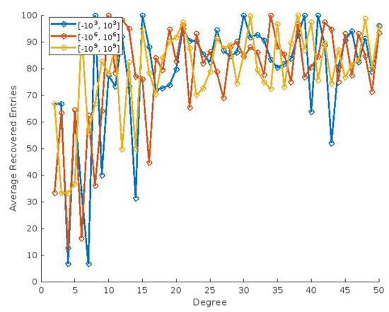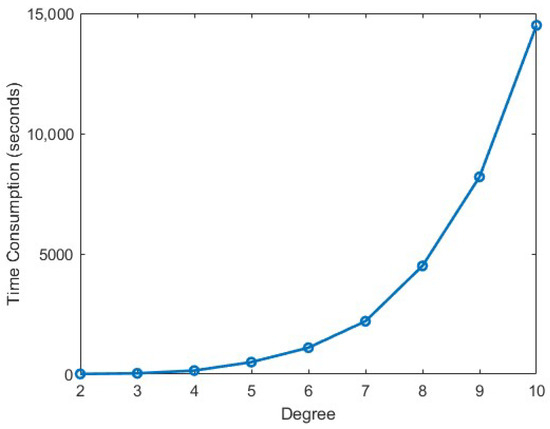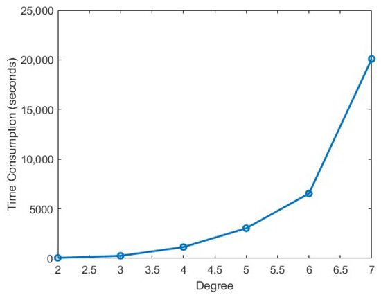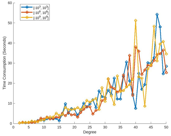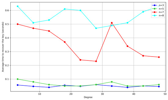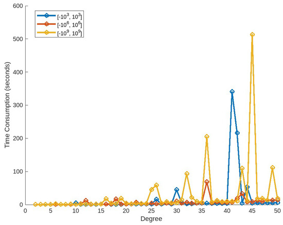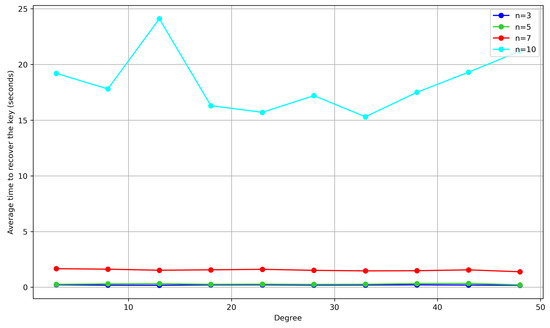 Furthermore, as Alice and Bob increase the range of entries for public matrices and polynomial coefficients, the objective function becomes more complex. Kotov–Ushakov attack (Algorithm 1) is not impacted by this, as it relies on solving a minimal covering problem that is independent of the individual entries (i.e., finding minimal covers using ’s, which are independent of the used entries). We will therefore also examine how Algorithm 3 performs under such conditions. Figure 1 shows the time taken in seconds to compromise Protocol 1 using Algorithm 3 for different degrees and entry ranges. All numerical experiments were executed on Windows 11 64-bit, with an Intel(R) Core(TM) i7-9750H CPU @ 2.60 GHz and 16.0 GB RAM.