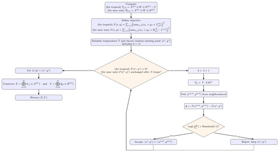 This objective function is complex with numerous local minima. However, the simulated annealing algorithm (see, e.g., ref. [20]), when initialized with a sufficiently high temperature parameter, effectively navigates these local minima and converges to the global minimum, where the objective function equals zero. The tropical and max–min objective functions are defined, respectively, in (6) and (7).