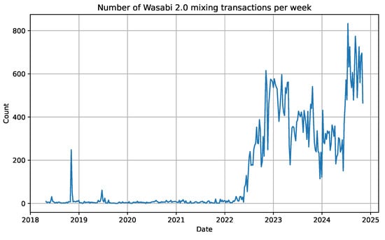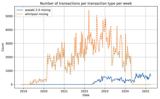 The Whirlpool CoinJoin service was offered by the Samourai and Sparrow wallets. After the arrest of the Samourai wallet developers (https://www.justice.gov/usao-sdny/pr/founders-and-ceo-cryptocurrency-mixing-service-arrested-and-charged-money-laundering, accessed on 17 September 2025) in April 2024 and the shutdown of the public coordinator servers (which offered the mixing service), Whirlpool CoinJoin transactions stopped being created on the blockchain. The sudden drop in the count of Whirlpool CoinJoin transactions can be observed in Figure 1 and aligns well with the arrest of developers.