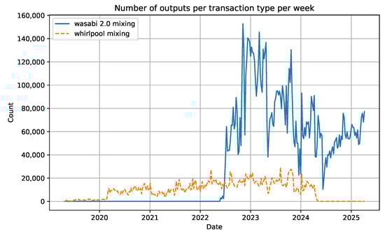 Number of Wasabi 2.0 and Whirlpool transactions between 2019 and 2025 per week. Wasabi 2.0 produces more outputs than Whirlpool, indicating higher usage (cf. [15]).