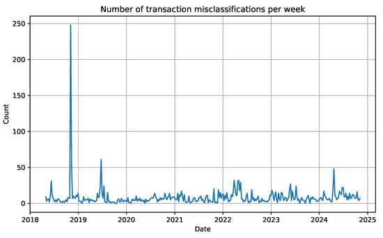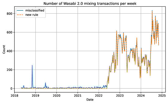 Number of transactions per week that have been identified by the proposed classification rule as misclassified Wasabi 2.0 transactions.