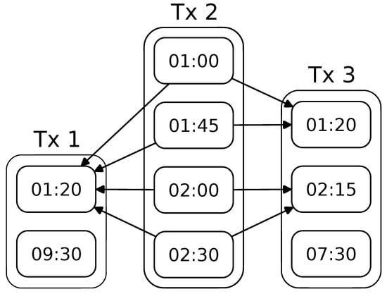 This transaction graph shows the one-sided Chamfer distance in action. With transaction 2 being the transaction of interest, it shows which input timestamps are used by the distance measure for transaction 1 and transaction 3. The two aberrations (09:30 in transaction 1 and 07:30 in transaction 3) are ignored.