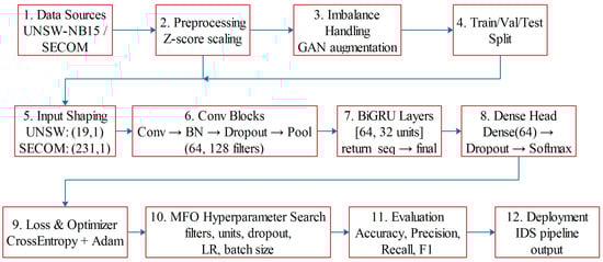 To construct the proposed intrusion detection framework for IoT platforms, the overall workflow is illustrated in Figure 1. The process begins with data acquisition from benchmark datasets (e.g., UNSW-NB15 and SECOM), followed by preprocessing through Z-score scaling and imbalance handling using GAN-based augmentation. After splitting the dataset into training, validation, and test sets, the data undergoes input shaping before being passed through convolutional blocks, BiGRU layers, and a dense head for classification. Hyperparameter optimization is performed using the MFO algorithm, and the system is evaluated using accuracy, precision, recall, and F1-score metrics before final deployment in the IDS pipeline (Figure 1).