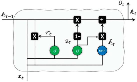 A technique created to address recurrent neural networks’ short-term memory issue is a GRU. Gates are inherent mechanisms that exist inside GRU networks [25]. Information flow is regulated by gates, which also decide which sequential data should be kept and which should be destroyed. In order to get the intended output, crucial information is sent along the sequence chain. The cell state, also referred to as the network’s internal memory, is a crucial part of the GRU network architecture. Cell states are updated by structures called gates and then communicated over the network. The GRU network has two gates—the reset gate and the update gate—that are often known as these. The GRU network employs a concealed state for data transmission and makes use of the sigmoid and tanh functions.