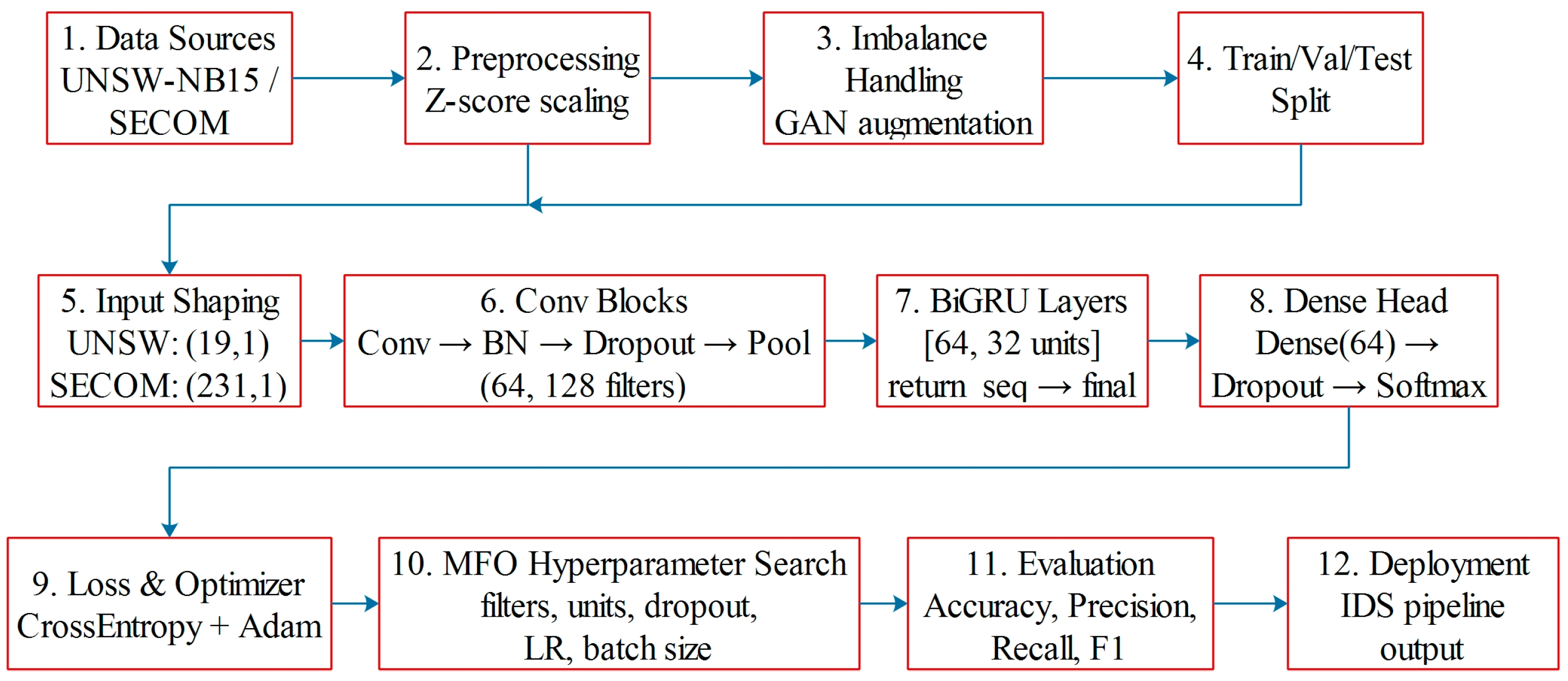 Figure 1. The process begins with data acquisition from benchmark datasets (e.g., UNSW-NB15 and SECOM), followed by preprocessing through Z-score scaling and imbalance handling using GAN-based augmentation. After splitting the dataset into training, validation, and test sets, the data undergoes input shaping before being passed through convolutional blocks, BiGRU layers, and a dense head for classification. Hyperparameter optimization is performed using the MFO algorithm, and the system is evaluated using accuracy, precision, recall, and F1-score metrics before final deployment in the IDS pipeline (