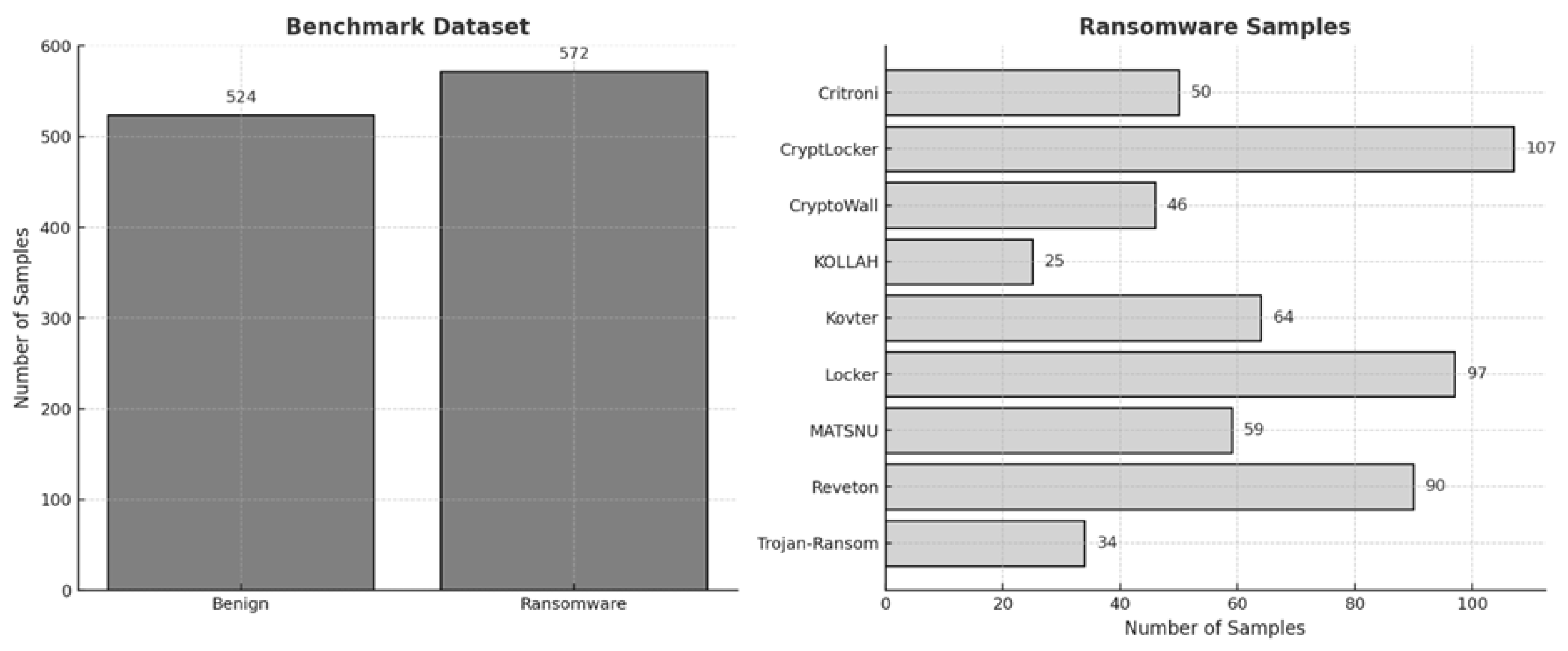 The benchmark dataset was obtained from the Kaggle website [28], containing 572 ransomware samples and 524 benign applications, a total of 1096 samples. This dataset includes 9 ransomware families, namely, Critroni, CryptLocker, CryptoWall, KOLLAH, Kovter, Locker, MATSNU, Reveton, and Trojan-Ransom (Figure 2). To analyze these samples, we used Cuckoo sandboxes v2.0.7 an open-source platform for examining suspicious files and URLs. Within a controlled virtual environment, the files were executed, and detailed reports were generated, capturing their behavior, including API call sequences and timing information.