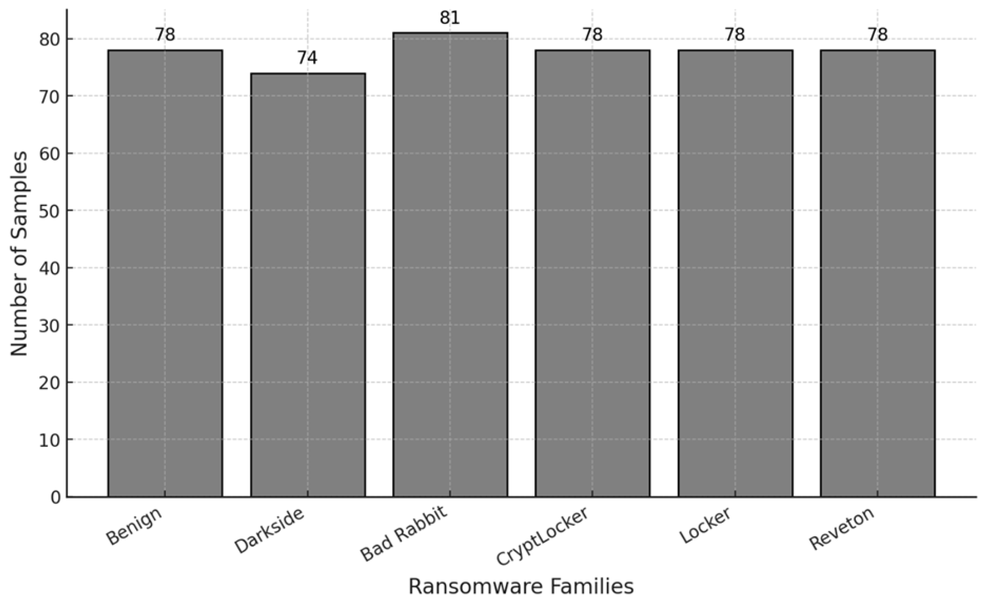 In addition to the benchmark dataset, we collected 467 ransomware samples and their corresponding hash values from sources such as Any.Run, GitHub, Malwarebytes, and Malware Bazaar. This dataset includes notable ransomware families such as Darkside, Bad Rabbit, CryptLocker, Locker, and Reveton (Figure 3). We used the VirusTotal platform to conduct dynamic analysis, executing the ransomware in a controlled sandbox environment. This allowed us to observe its behavior closely without endangering real systems. The sandbox captured the following: