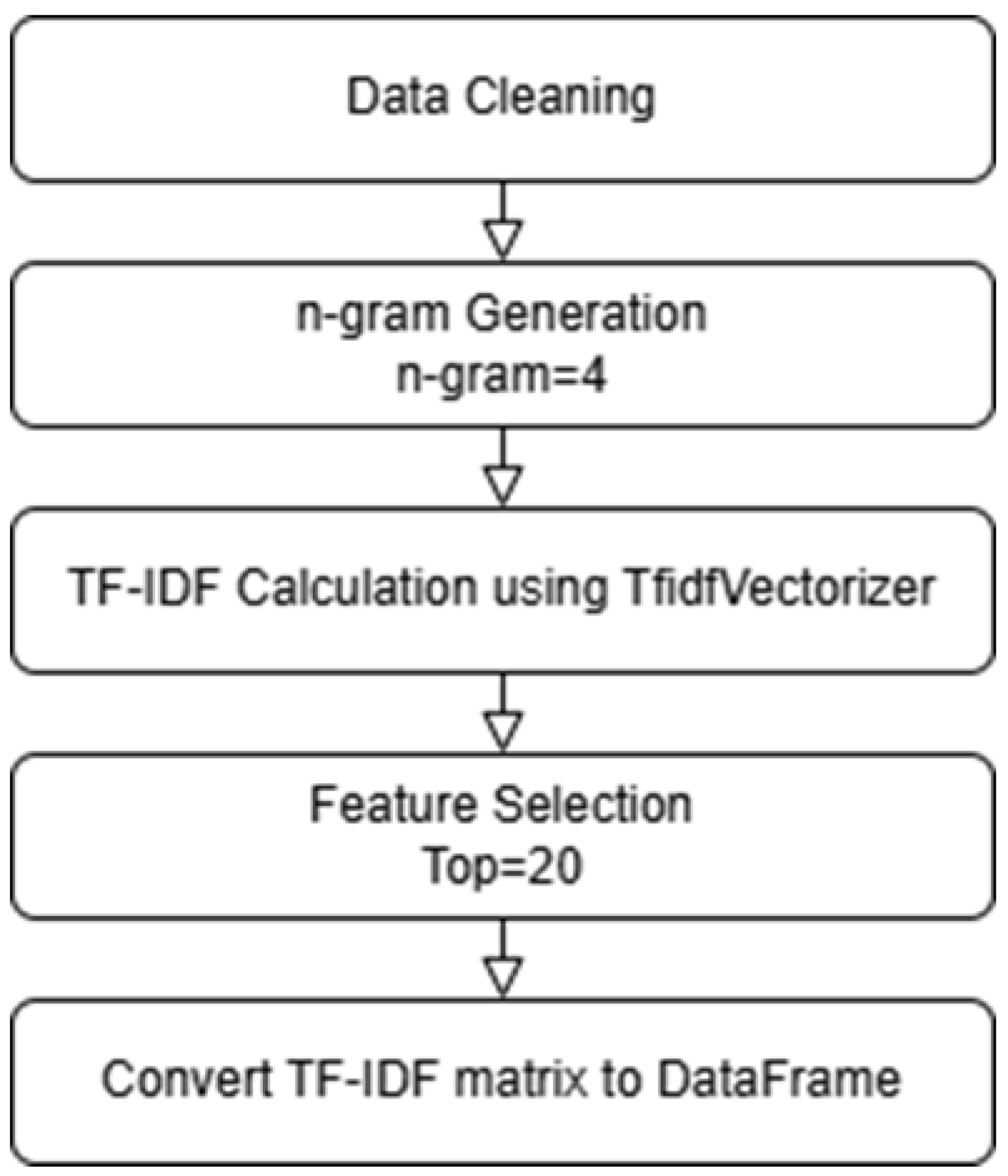 In this study, API sequences were represented using 4 g modeling, which preserves the contextual relationship between consecutive calls and better reflects the behavioral patterns of ransomware families. To improve efficiency and reduce noise, we retained only the top 20 features ranked by TF-IDF, thereby ensuring that the most distinctive patterns were emphasized while minimizing redundant or less informative features.