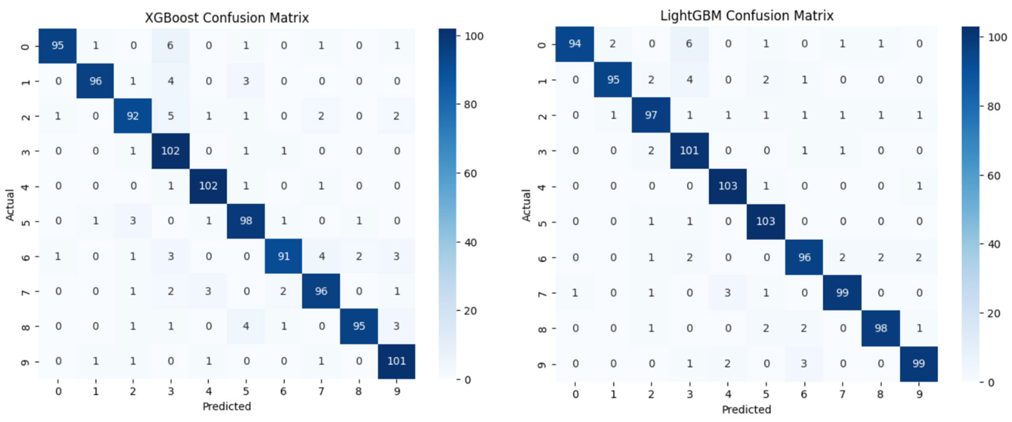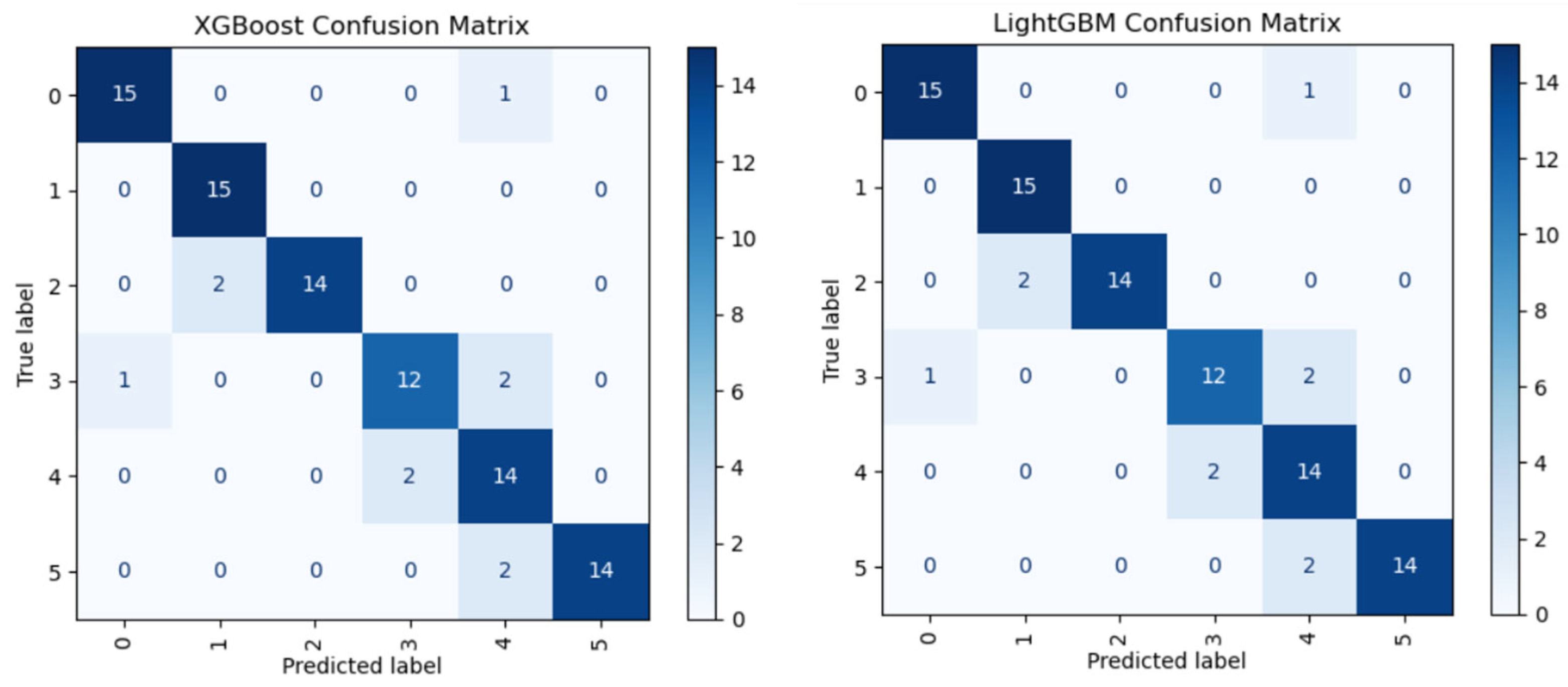 To evaluate the classification performance, a confusion matrix for the XGBoost and LightGBM models is presented in Figure 5. Both models achieved high overall accuracy (~93%), which has strong true positive rates and relatively low FP and FN across ransomware families.